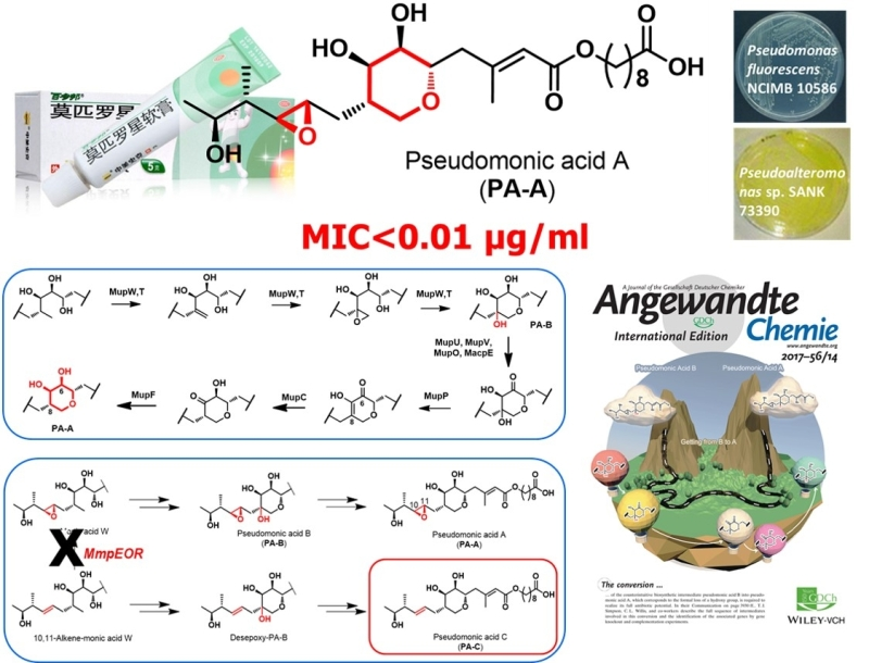 图1:阐述临床首选局部抗感染药物莫匹罗星的生物合成途径(J. Am. Chem. Soc. 2014; Chem. Sci. 2014; Angewandte Chem. Int. Ed. 2014等)