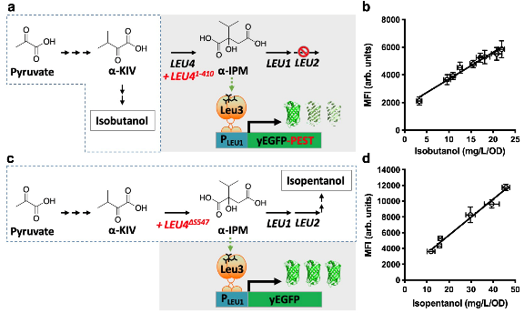 27) Zhang Y., Cortez, J.D. Hammer S.K., Carrasco-Lopez C., Garcia Echauri S.A.,Wiggins J.B., Wang W., Avalos J.L. Biosensor for branched-chain amino acid metabolism in yeast and applications in isobutanol and isopentanol production. Nature Communications 13, 270 (2022). https://doi.org/10.1038/s41467-021-27852-x