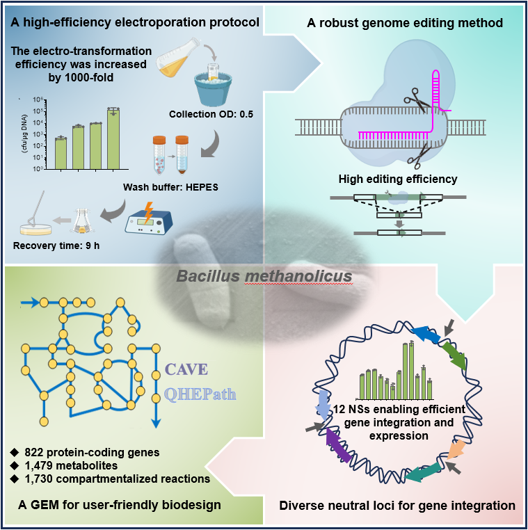 甲醇低价易得、能量密度高,可以利用CO2、生物质为原料规模化生产,是生物制造理想的非粮替代原料。甲醇芽孢杆菌是可高效利用甲醇作为唯一碳源和能源的天然甲基营养菌,并能够适应50℃高温和海水培养基,在甲醇等一碳原料的生物转化利用中拥有极大的应用潜力。但是关于甲醇芽孢杆菌的研究仍然比较初步,尤其是缺乏高效的基因组编辑、生物设计等使能技术,严重阻碍了该一碳生物制造新底盘的开发应用。