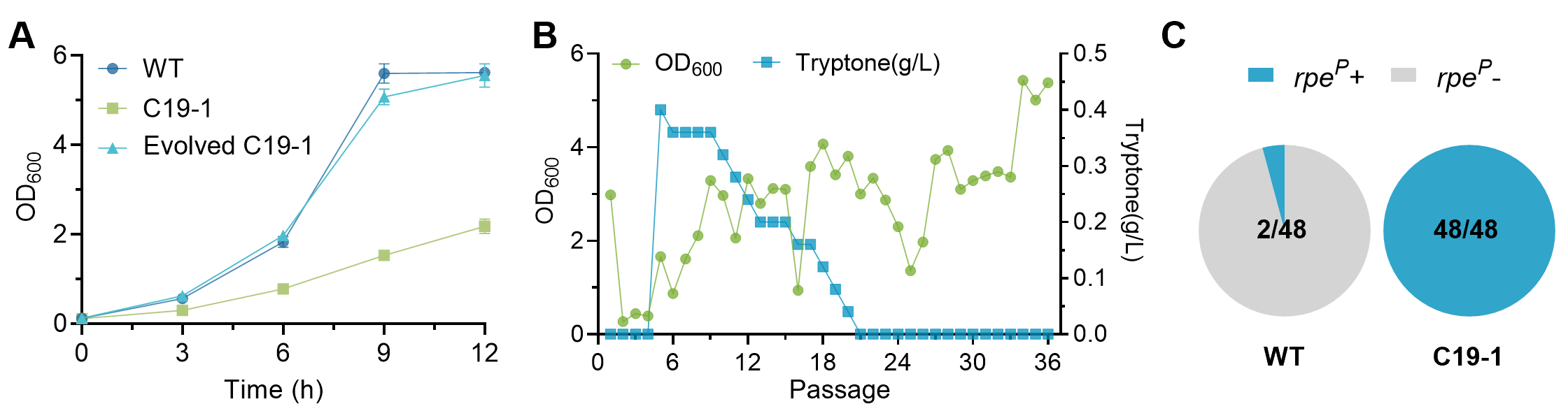 此外,研究团队鉴定和评估了12个用于基因稳定整合和表达的染色体中性位点。它们在不同条件下对菌体生长影响较小,并具有不同的表达水平,为基因表达的精细调控提供了广泛选择。研究团队将对甲醇代谢至关重要的19 kb大质粒pBM19整合至中性位点进行表达,同时敲除内源质粒,获得了无质粒的新型工程底盘。通过适应性进化,该底盘展现出稳定且强健的生长特性,既避免了质粒丢失风险,也消除了菌株退化的隐患(图3)。