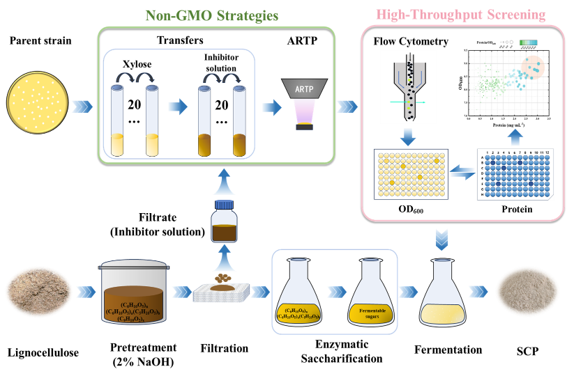 近日,中国科学院天津工业生物技术研究所蛋白表达系统与微生物代谢研究组围绕“以秸秆为碳源高效合成单细胞蛋白”开展系统研究,筛选并构建了高性能马克斯克鲁维酵母(Kluyveromyces marxianus)工程菌株。研究团队将适应性实验进化(adaptive laboratory evolution,ALE)与等离子体随机诱变(ARTP)及高通量筛选相结合,系统提升了菌株的木糖利用能力、对秸秆碱处理过程中产生抑制物的耐受性以及菌体蛋白合成水平。
