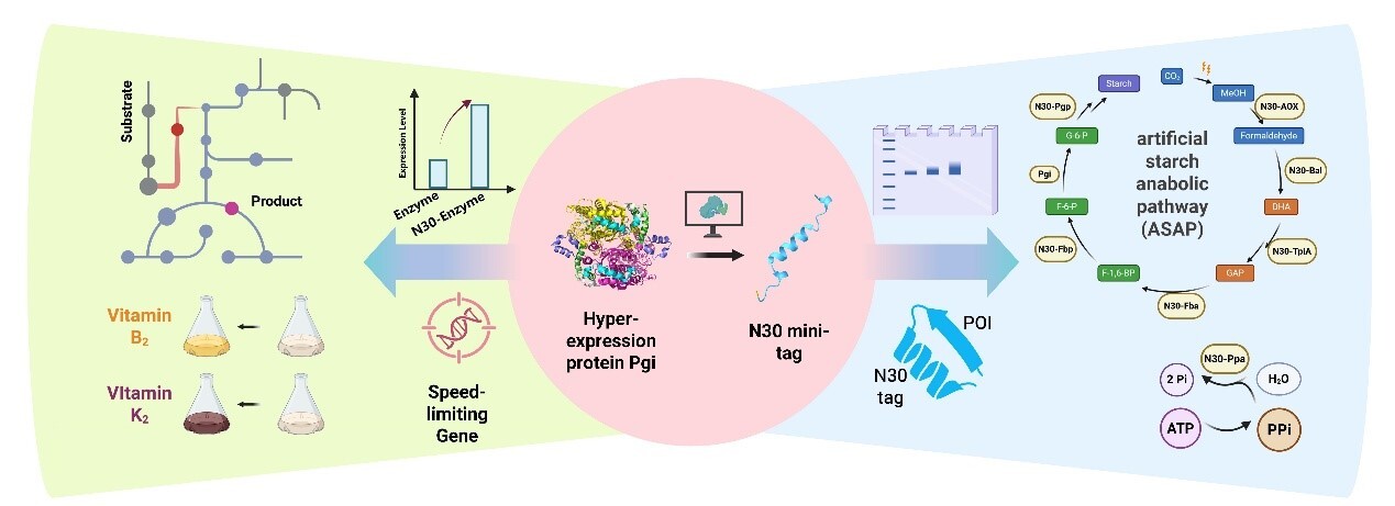 中国科学院天津工业生物技术研究所张大伟研究员带领的蛋白质表达系统与微生物代谢研究团队,基于枯草芽孢杆菌中高分泌表达蛋白葡萄糖-6-磷酸异构酶(phosphoglucose isomerase, Pgi)的结构特征,利用蛋白质三维结构的区域截断分析策略,鉴定并开发了一种30个氨基酸的N端微标签N30。该标签能够显著提高多种异源蛋白的表达与分泌水平,在人工淀粉合成途径中实现八种关键酶的高水平分泌表达,同时针对N30标签中暴露的疏水残基突变为亲水或带电氨基酸,进一步将N30 (M22D)-TpiA的分泌表达水平提升至15 g/L。此外,N30 还能使多种真核蛋白在枯草芽胞杆菌中实现从无到有的表达,拓展了原核宿主表达真核酶的能力边界。同时,维生素合成途径中限速酶的N30融合表达使维生素B2和维生素K2的滴度分别提高了2.4倍和2.3倍,表明了N30在蛋白质表达和代谢工程应用中的通用性和高效性。该研究提供了一种小型化、高效且高普适性的蛋白表达增强工具,为多酶级联体系中酶蛋白的低成本制造及高附加值化学品的生物制造提供了新的通用优化工具。