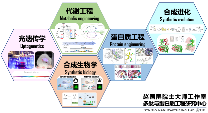 多肽与蛋白质工程研究中心是国家合成生物技术创新中心/中国科学院天津工业生物技术研究所的一个重要研究单元。立足合成生物技术创新,致力于研究成果的转化应用,聚焦多肽与蛋白质工程研究,主要开展合成生物学源头技术开发和绿色低碳生物制造应用等方面的研究。赵国屏院士大师工作室(多肽与蛋白质工程研究中心)的使命是探寻生物技术方案,以应对和解决资源、环境、健康、生物制造方面的需求和挑战。为了实现这一目标,研究组整合了微生物学、分子生物学、细胞生物学、生物化学、结构生物学、蛋白质工程学和生物信息学等多种学科,运用合成生物学(工程生物学)策略对基因、蛋白质、细胞器、细胞和微生物群落进行改造。