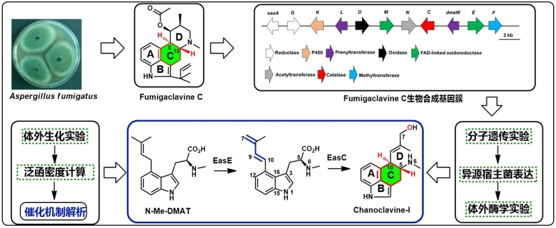 3. 解析了重要精神类疾病治疗药物麦角生物碱中央C环的合成机制,并构建了基于构巢曲霉的麦角生物碱药物的发酵新菌种(J. Am. Chem. Soc. , 2019; Metab. Eng., 2022等)