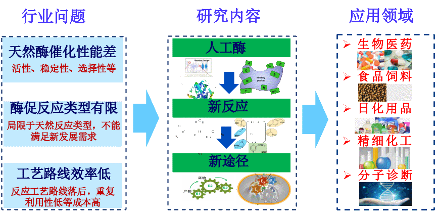 工业生物技术是人类应对环境问题、能源问题和资源问题的重要解决方案,酶是核心发动机,广泛应用于食品,医药,农产品加工等行业,是实现生物催化合成的基本功能单元。团队围绕工业酶设计与绿色生物催化,重点开展酶分子工程、代谢工程、生物合成等方向的基础与应用研究。