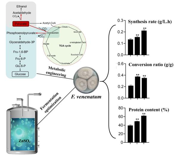 中国科学院天津工业生物技术研究所李德茂研究员带领的工业生物系统工程研究组和王钦宏研究员带领的进化与代谢工程研究组等,以威尼斯镰刀菌TB01菌丝体蛋白发酵生产中副产物乙醇大量合成导致碳源流失这一关键限制因素为突破口,以转录组和代谢组分析为导向,靶定以阻断副产物乙醇合成和糖异生途径为主的丙酮酸代谢途径重塑来减少碳代谢流流失和强化TCA循环。在结合发酵优化后,最终实现菌丝体蛋白合成速率、碳源转化率和蛋白含量的同步提升,使获得相同蛋白质产量的情况下,工程菌株发酵所需的葡萄糖消耗量减少61%。