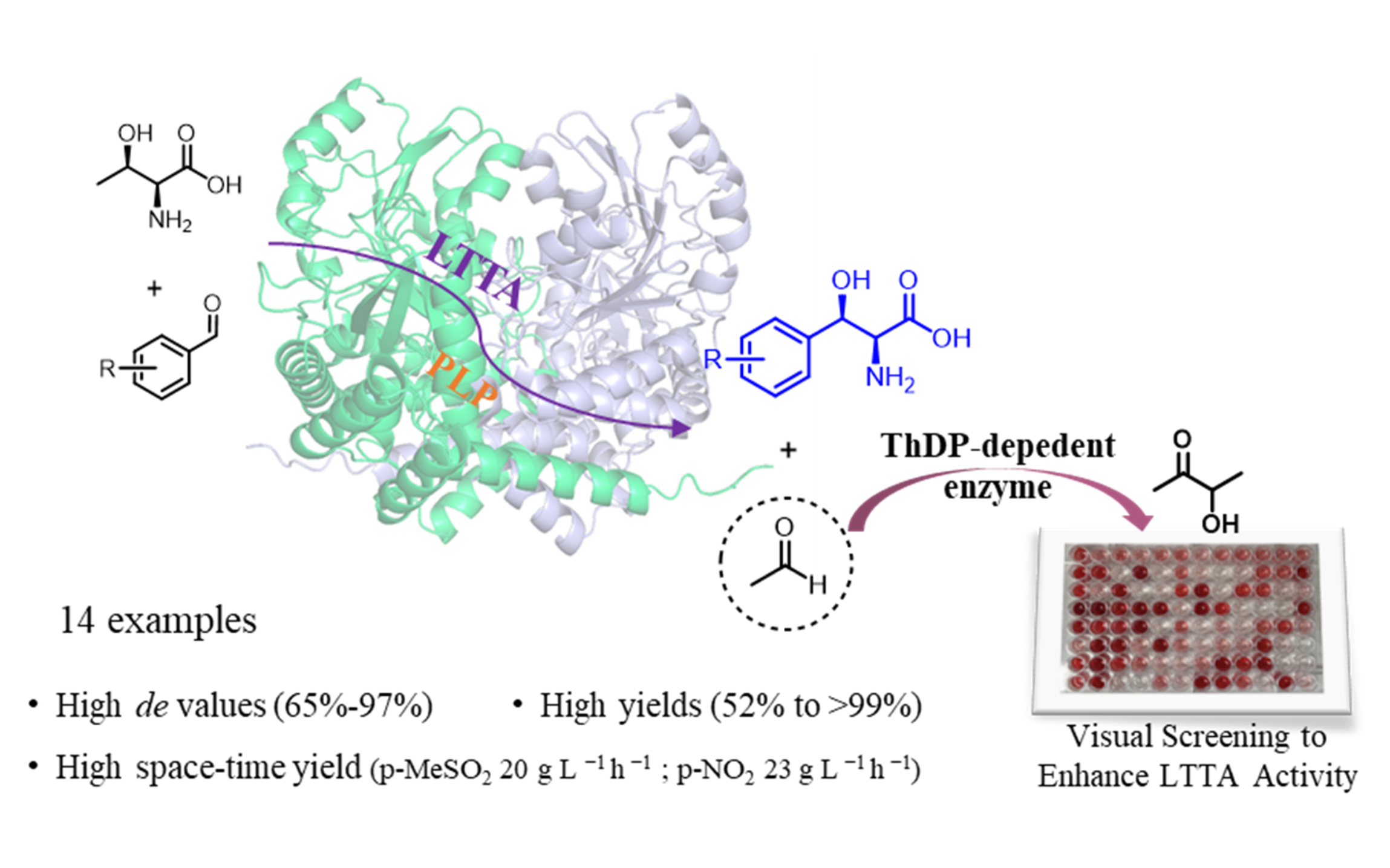 中国科学院天津工业生物技术研究所朱敦明、吴洽庆研究员带领的生物催化与绿色化工研究团队为实现转醛醇酶的高效快速筛选,开发了一种基于焦磷酸硫胺素(ThDP)依赖型酶的可视化高通量筛选技术,并对来源于假单胞菌(Pseudomonas sp. EMN2)的l-苏氨酸转醛醇酶进行设计改造,获得了催化活性与立体选择性都大幅提高的突变体酶,实现了不同β-羟基-α-氨基酸类化合物的高效不对称合成。针对对甲砜基苯甲醛这一底物,突变体M3相较于野生型,催化效率(kcat/Km)提高160倍且立体选择性(de值)高达97.3%。利用突变体M3实现了两种关键药物中间体(l-threo-对甲砜基苯丝氨酸和l-threo-对硝基苯丝氨酸)的克级规模制备,时空产率分别达到20 g L-1 h-1、23 g L-1 h-1,为进一步工业化应用奠定了坚实的基础。