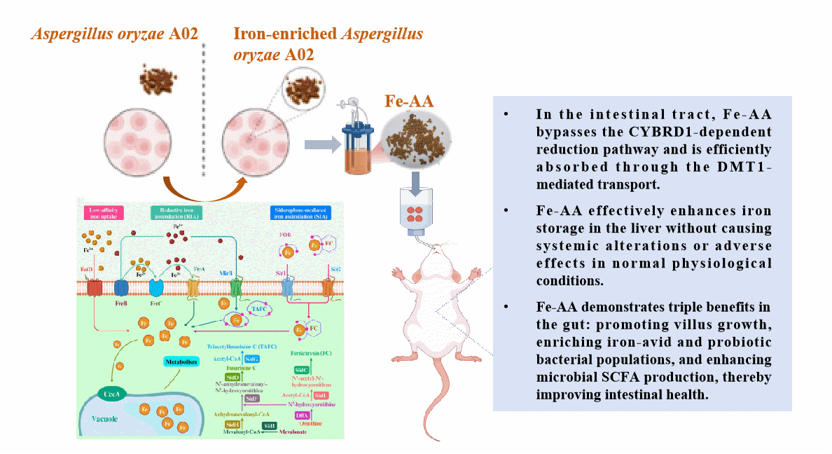 富铁米曲霉A02生物合成示意图及其补铁和改善肠道健康的作用