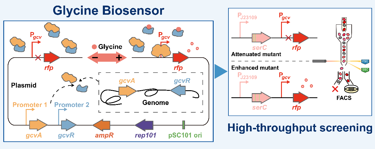 中国科学院天津工业生物技术研究所微生物代谢工程研究团队利用大肠杆菌中天然的GcvA/GcvR转录调控系统,成功构建出可以实时响应甘氨酸浓度的生物传感器。该系统通过平衡激活因子GcvA与抑制因子GcvR的表达水平,显著降低了背景荧光噪音,并实现了16.45倍的甘氨酸诱导荧光增强。进一步结合荧光激活细胞分选技术,将传感器应用于磷酸丝氨酸氨基转移酶(SerC)突变体的筛选,最优突变体使甘氨酸含量提高了2.25倍。该工作首次构建了基于转录调控因子的特异性甘氨酸生物传感器,也为其它氨基酸及小分子代谢物的检测提供了模块化设计策略。