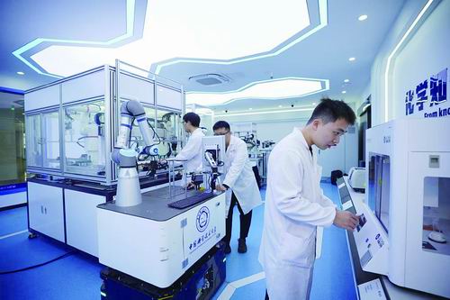 精准智能化学全国重点实验室内,科研团队利用机器化学家开展工作。中国科大供图